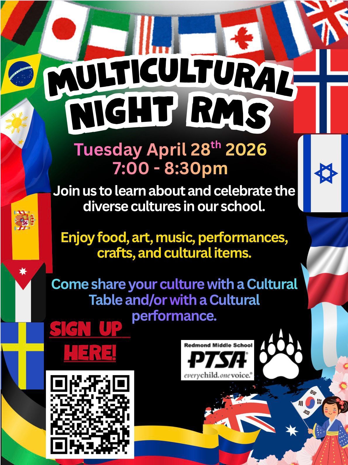 Hello RMS families, we are excited to announce that our cultural night is on April 28th from 7PM to 8PM. Kindly sign up for Representing a Country/Culture Table and CULTURAL PERFORMANCES at the link below: